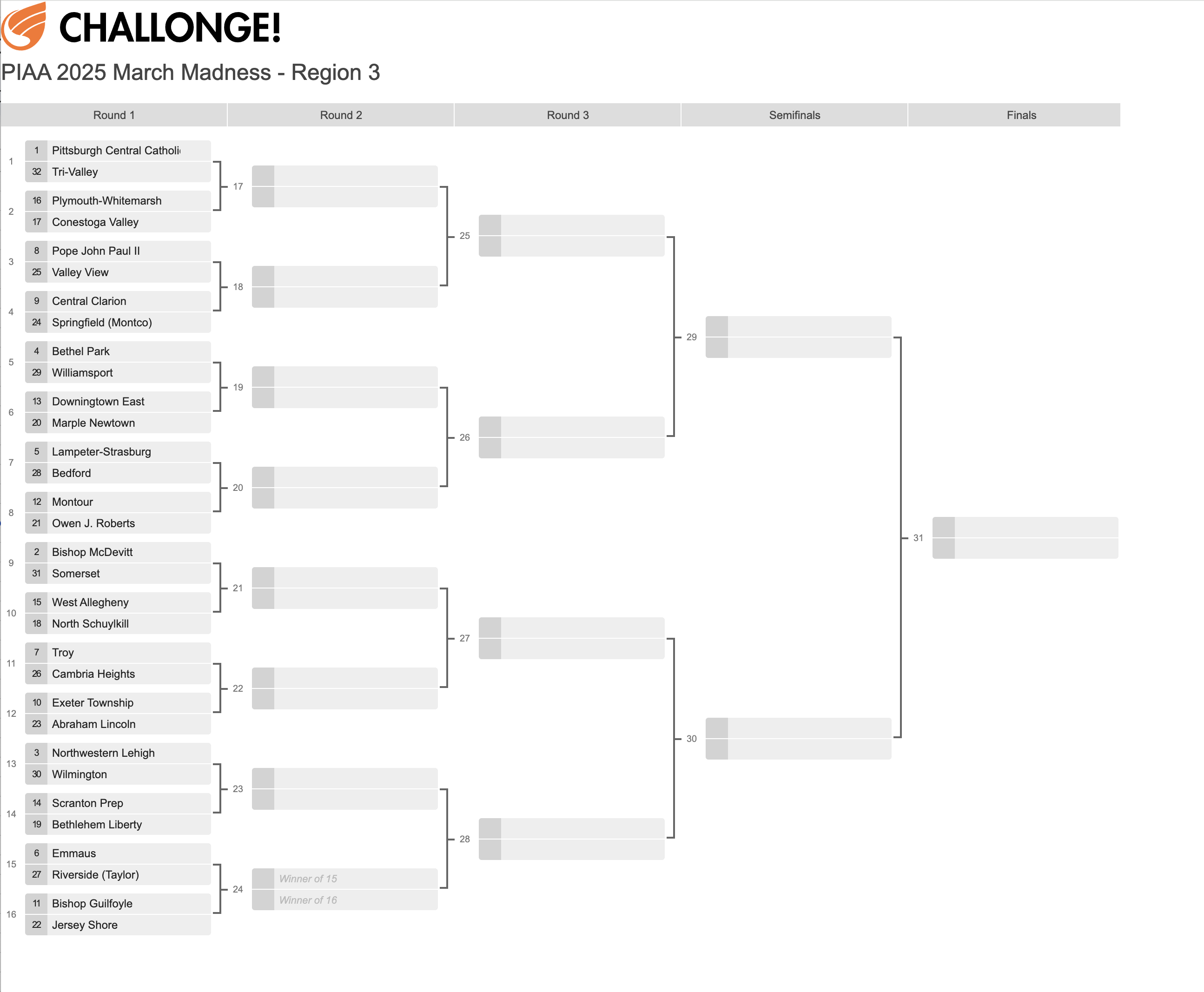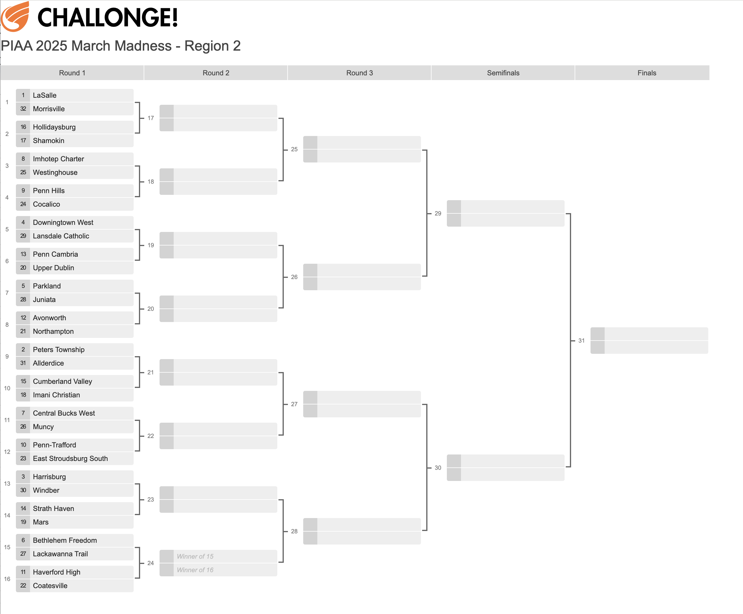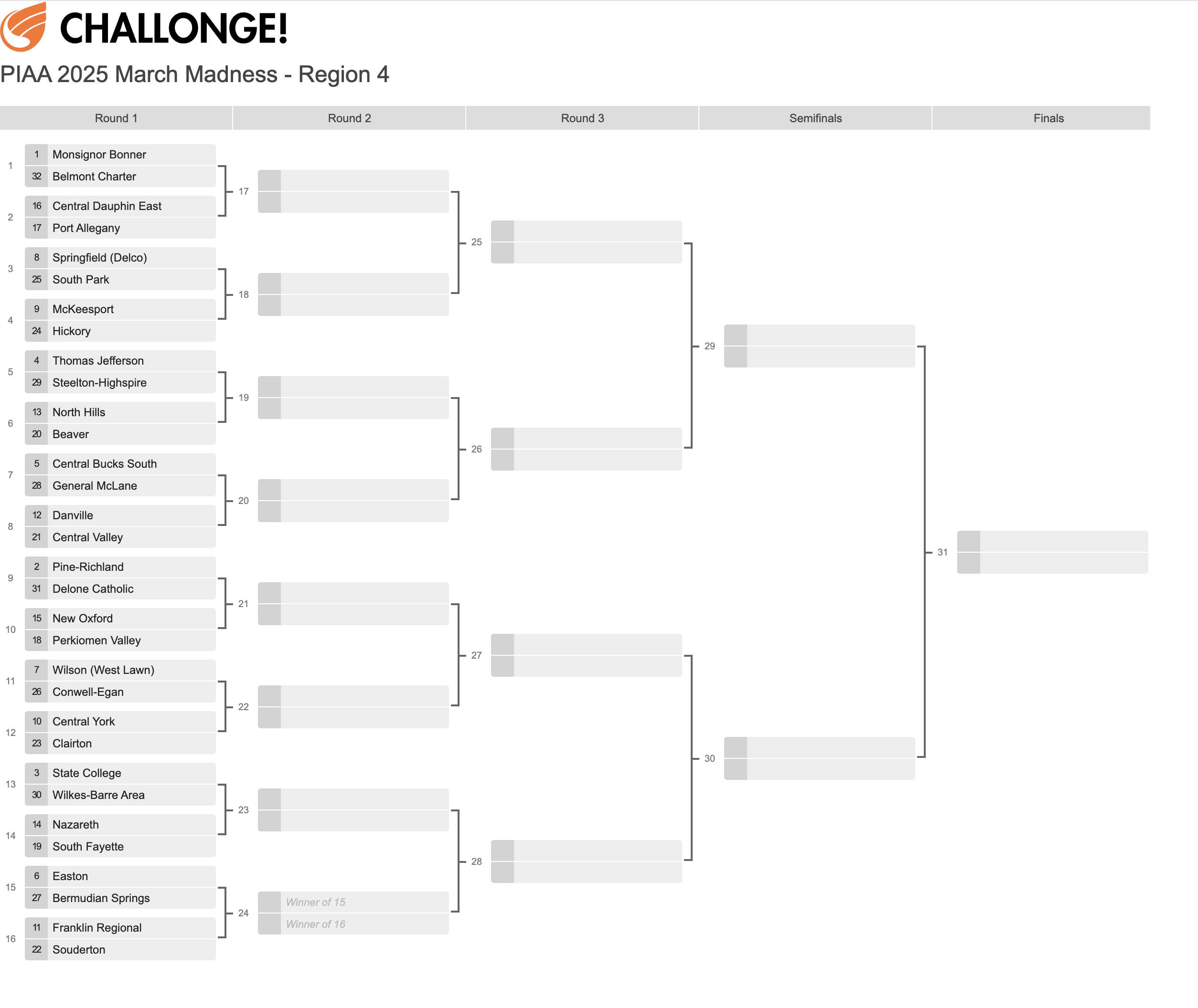 Once all 128 slots were filled, teams were ranked by their HSRatings.com computer ratings to create a fully seeded list, from 1 to 128. Then, in the same method the NCAA Selection Committee uses, those 128 teams were assigned regions and seeds using an “S-Curve” process. The four 1-seeds were St. Joseph’s Prep, LaSalle, Pittsburgh Central Catholic and Monsignor Bonner. The S-Curve then paired the strongest 2-seed (Pine-Richland) with the lowest-rated 1-seed (Bonner), and continued snaking its way through the entire field. After that, four separate 32-team brackets were built. I gave them generic names, but we could take things a step further and name them geographically as in the NCAA Tournament. You can choose to think of these as the East, South, Midwest and West (or Erie, Pittsburgh, Scranton and Philadelphia?) regions if you’d like.